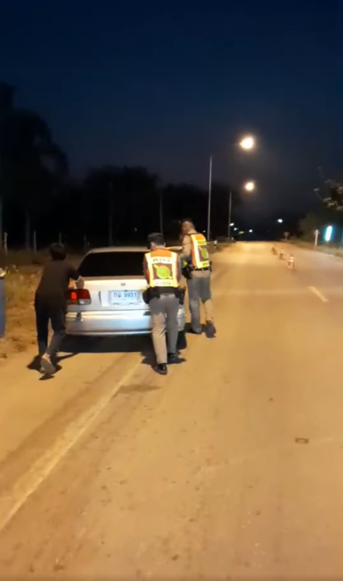 - ตำรวจได้ให้ความช่วยเหลือ โดยการดันรถลงไหล่ทางด้านซ้าย เพื่อสำรวจและซ่อมแซม ตรวจเช็ครถแล้วพบว่า มีน้ำเข้าหัวเทียนรถ ได้นำผ้าแห้งเช็ดหัวเทียนจนแห้ง รถจึงสามารถสตาร์ทเครื่องติดจนสามารถเดินทางต่อไปได้
