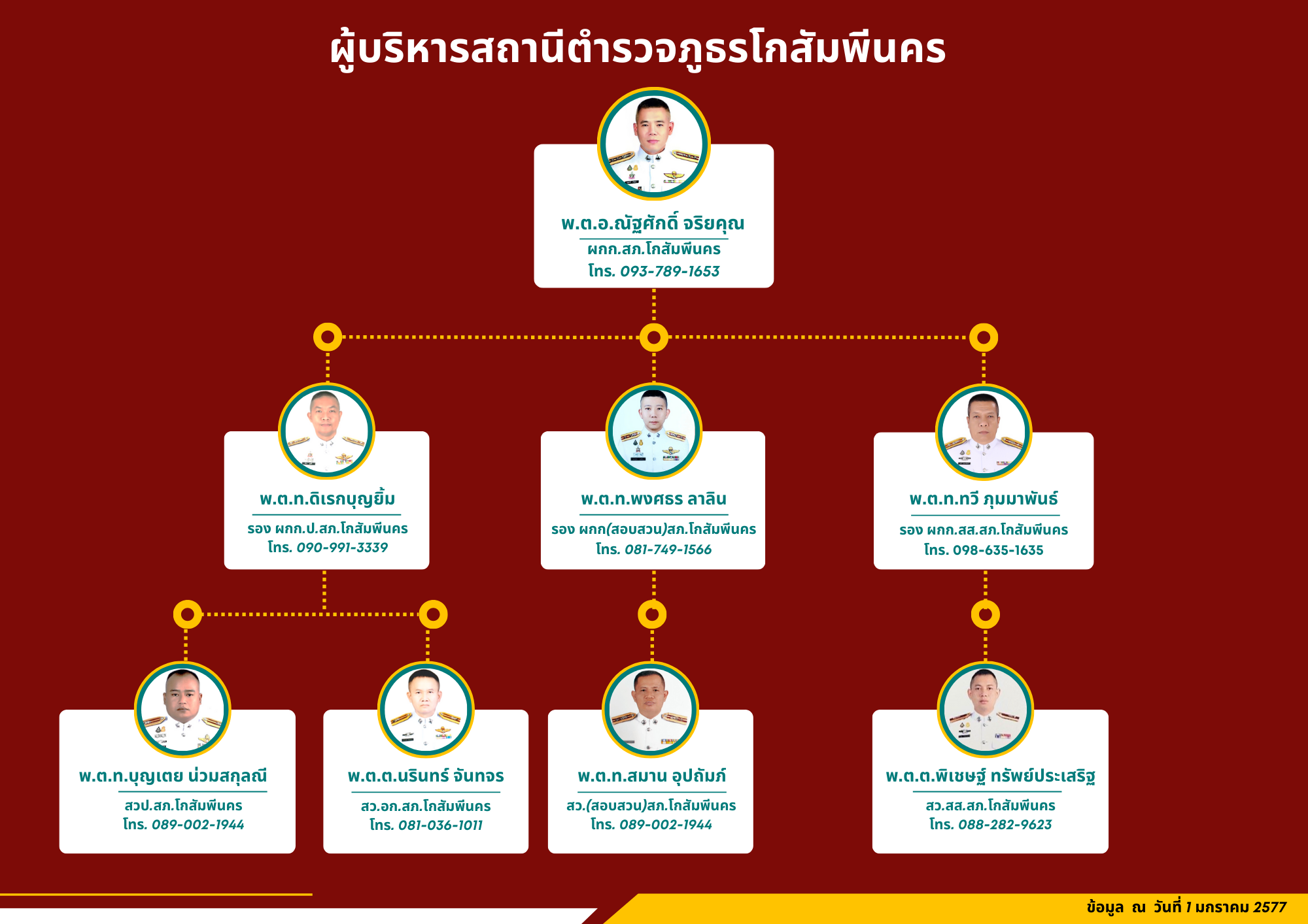 สถานีตำรวจภูธรโกสัมพีนคร. (2567). โครงสร้าง อัตรากำลัง ข้อมูลผู้บริหาร. สืบค้น 16 ธันวาคม 2568, จาก https://kosamphinakhon.kamphaengphet.police.go.th/?lang=TH&page_id=73